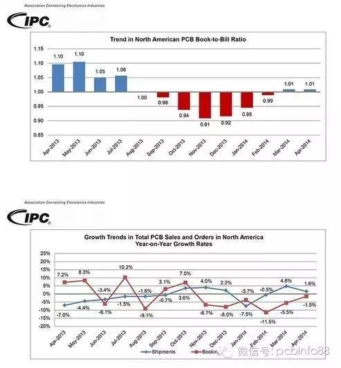 2014年4月份北美地區(qū)PCB總出貨量,同比增長1.6%,把年初至今的出貨量推高至-0.2%。與上月相比,PCB出貨量環(huán)比下降12.0%。